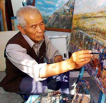 80岁高龄的察布查尔锡伯自治县锡伯族退休教师何耶尔·兴谦5月25日在自家举办了个人画展。此次画展展出了他的46幅油画作品,其中多幅作品为首次展出。